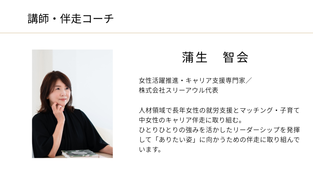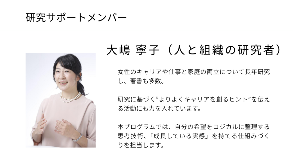 “復職・再就職後のキャリアを、もう一度見つめ直したい女性” のために開発した実践型プログラムです。